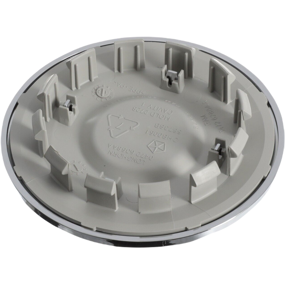 Fitment: F & R The vehicle options this part fits: Fitting Vehicle Options: 2 - Med. Duty DODGE 2WD, 62 - REG CAB 8 FT BOX, 7 - Med. Duty DODGE 4WD, 81 - Mega Cab, 91 - CREW CAB W.B.2, 92 - CREW CAB W.B.3 Make/Model/Year: Dodge Ram 2500 2014-2018 Dodge Ram 3500 SRW 2014-2018 Product Specifications: Product ID: C2475LL Product: Center Cap (Single) Material: Plastic Finish: Chrome Size: 3 3/4 Inch Diameter Indents: 04726280AA, 04726368AA, 5RK12TRMAA OE Part Number: 04726368AA Notes: Laramie LongHorn Edition. 4726368AA; ;
